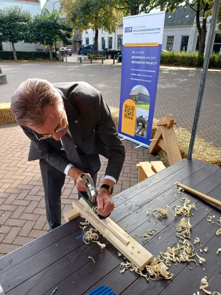 Een bijzondere bijdrage kwam van gedeputeerde Harry van der Maas, die een toognagel schaafde en deze in een houtverbinding aanbracht.